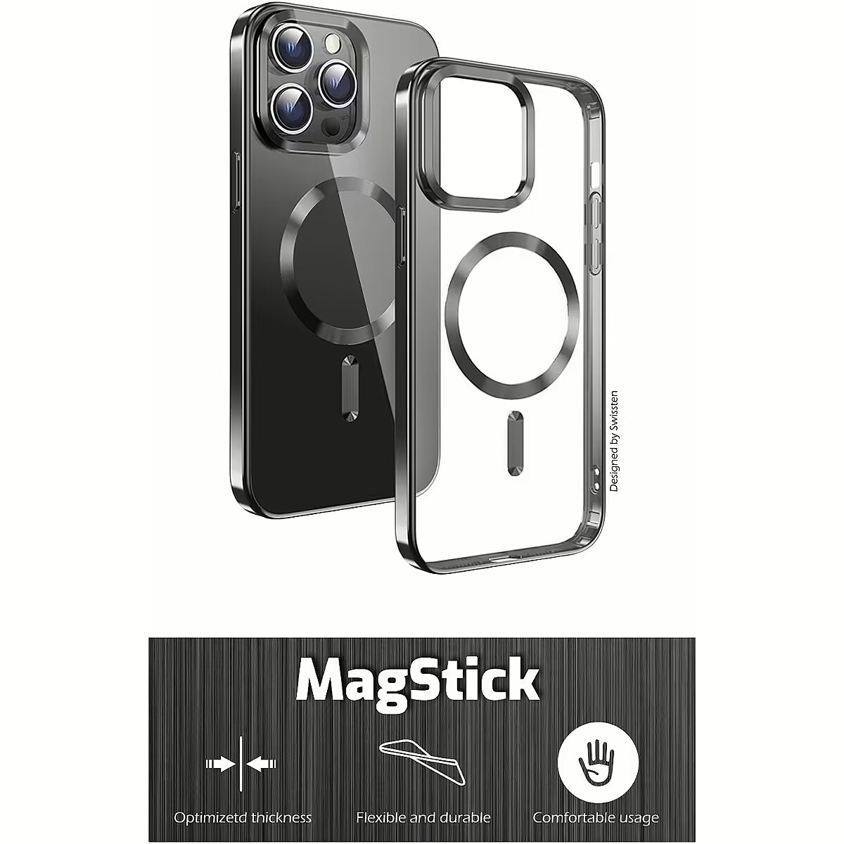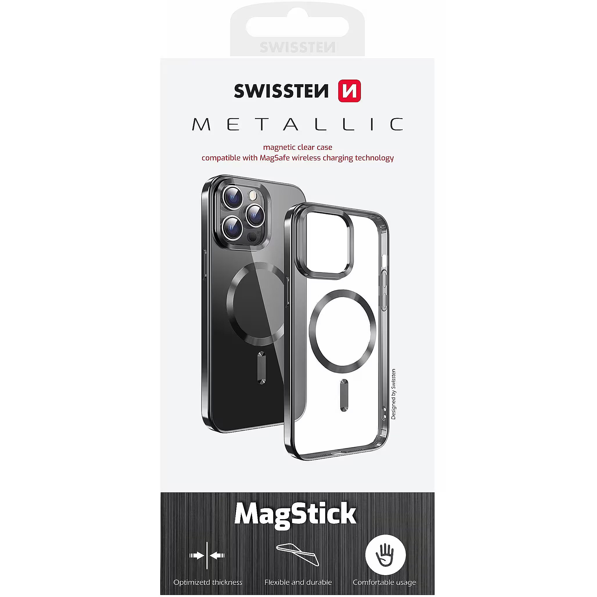 description_ru - Роскошный прозрачный металлический корпус SWISSTEN MagStick с элегантной черной рамкой и металлическими аксессуарами. Подходит для подзарядки MagSafe. MagSafe