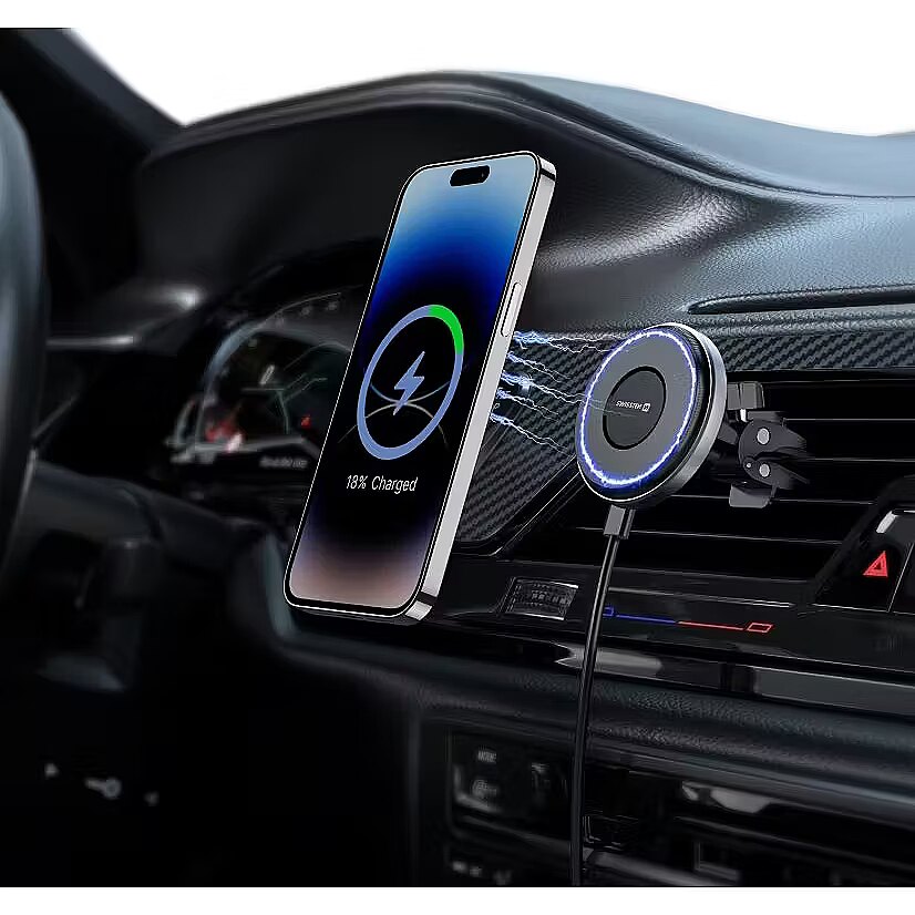 Благодаря сильным магнитам и совместимости с MagSafe оно надежно удерживает iPhone или другое совместимое устройство, одновременно обеспечивая беспроводную зарядку мощностью до 15 Вт (7,5 Вт для iPhone).