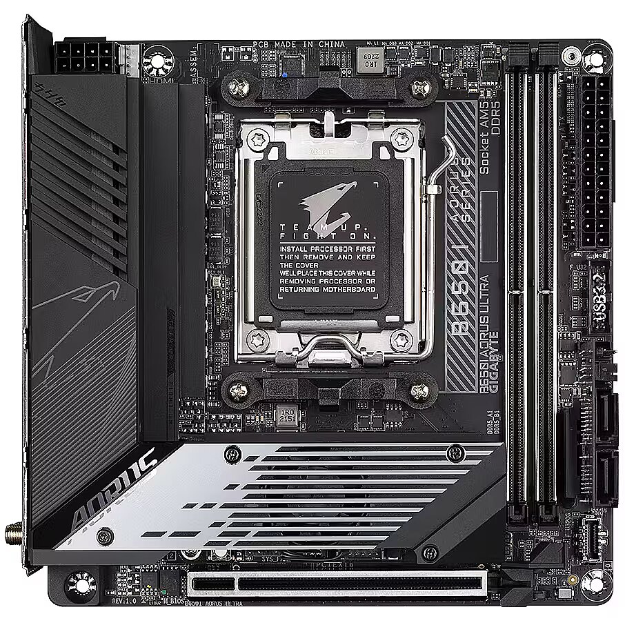 ProductName - B650I AORUS ULTRA Motherboard - Supports AMD Ryzen 9000 CPUs, 8+2+1 Digital VRM, up to 7200MHz DDR5 (OC), 1xPCIe 5.0 + 2xPCIe 4.0 M.2, Wi-Fi 6E, 2.5GbE LAN, USB 3.2 Gen 2x2