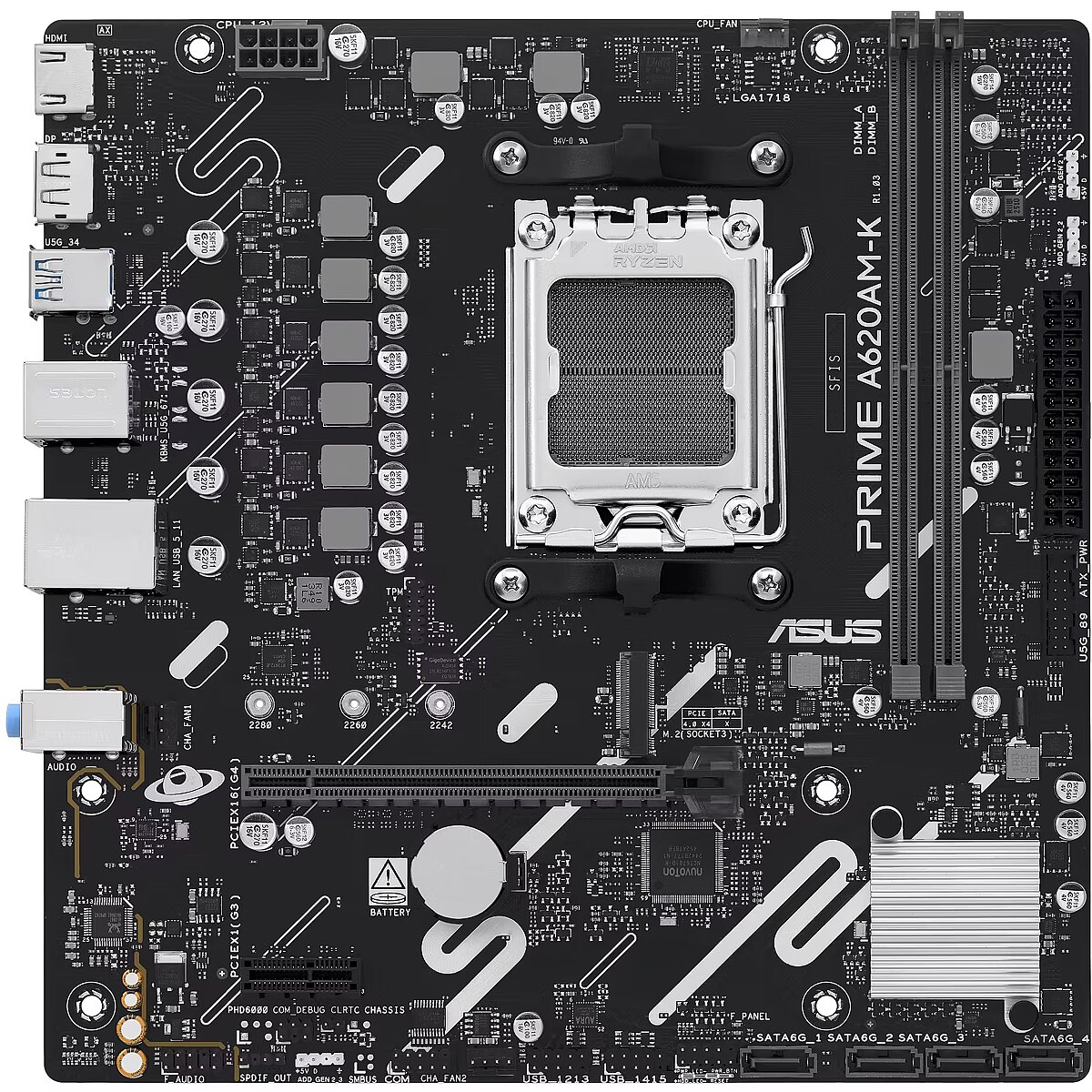 ShortSummaryDescription - ASUS PRIME A620AM-K, AMD, Socket AM5, AMD Ryzen 7000 Series, AMD Ryzen 8000 Series, AMD Ryzen 9000 Series, Socket AM5, DDR5-SDRAM, 128 GB