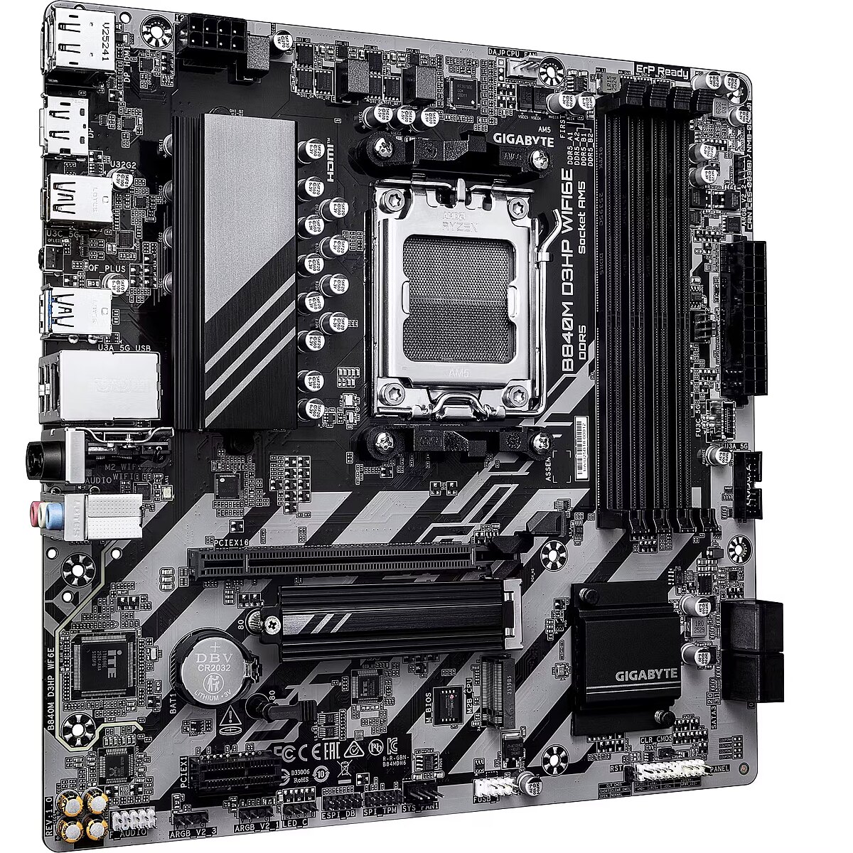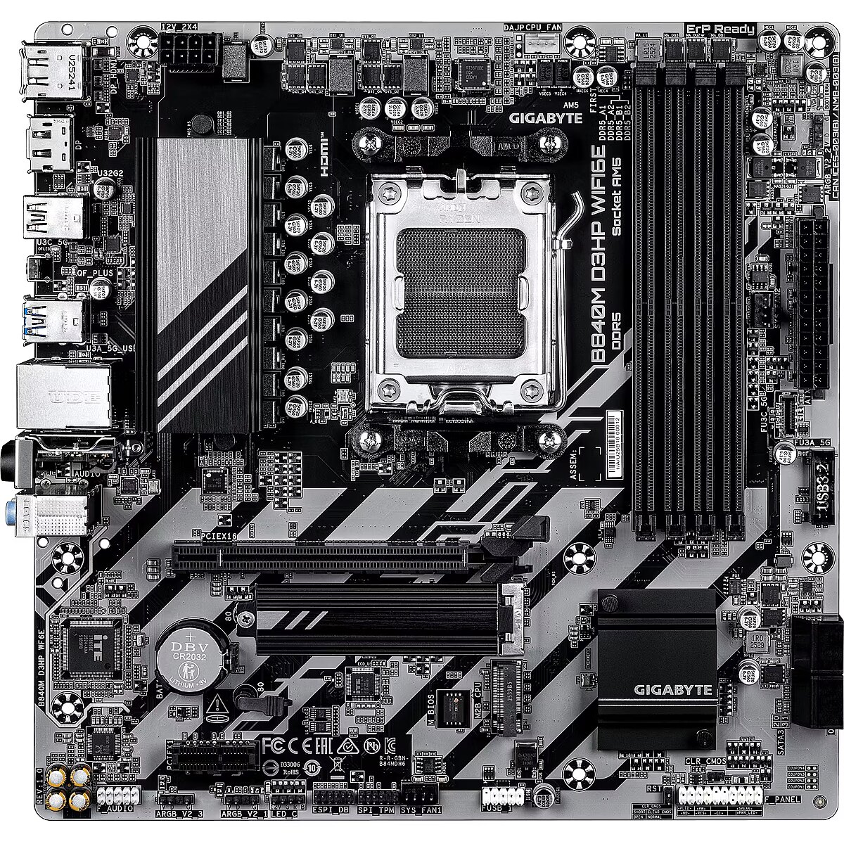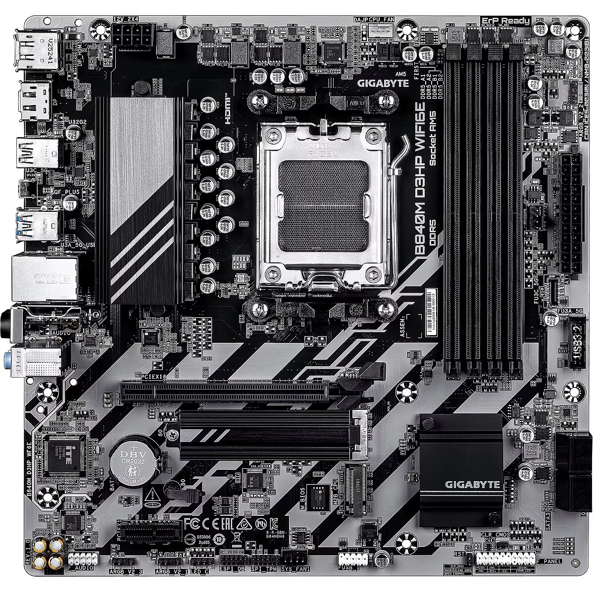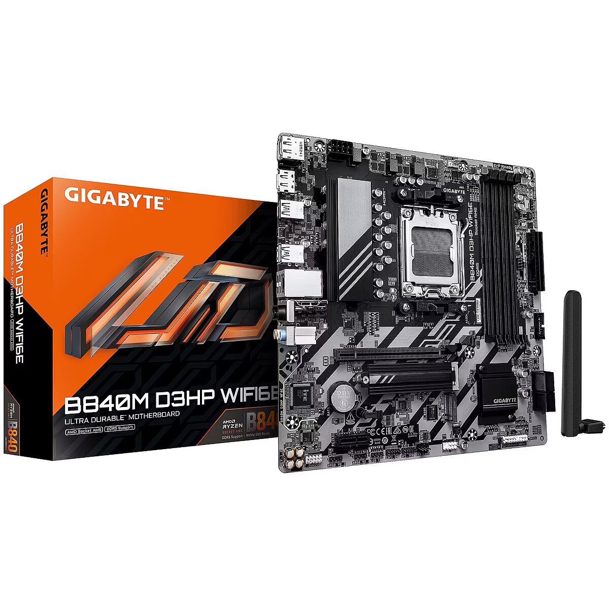 ShortSummaryDescription - GIGABYTE B840M D3HP WIFI6E Motherboard - AMD Ryzen 9000 CPUs, 8+2+2 Phases VRM, up to 8200MHz DDR5(O.C), 2xPCIe 4.0 M.2, Wi-Fi 6E, 1GbE LAN, USB 3.2 Gen 2, AMD, Socket AM5, AMD Ryzen 7000 Series, AMD Ryzen 8000 Series, AMD Ryzen 9000 Series, Socket AM5, DDR5-SDRAM, 256 GB