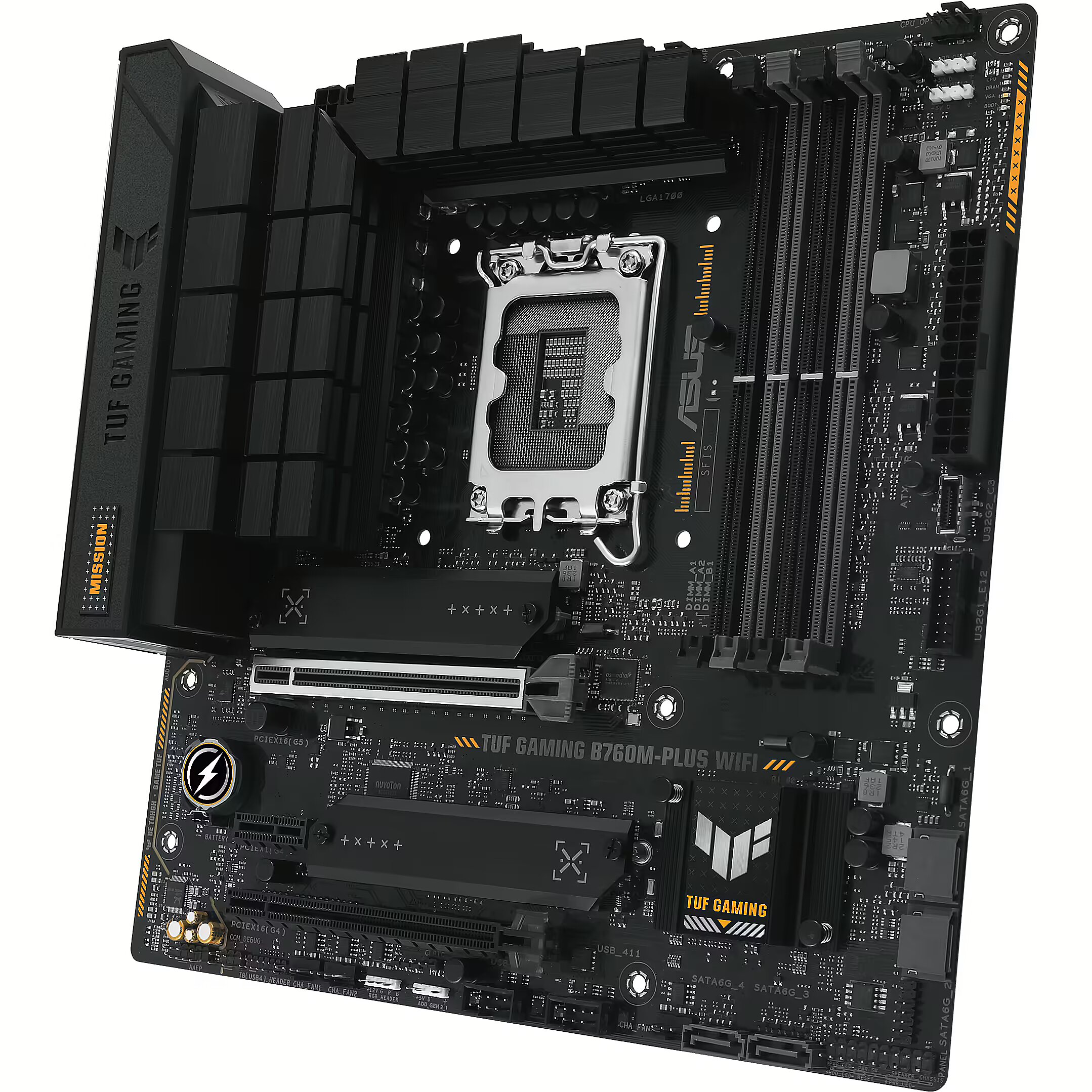 LongDesc - TUF GAMING B760M-PLUS WIFI takes all the essential elements of the latest Intel® processors and combines them with game-ready features and proven durability. Engineered with military-grade components, an upgraded power solution and a comprehensive cooling system, this motherboard goes beyond expectations with rock-solid performance for marathon gaming. TUF GAMING motherboards also undergo rigorous endurance testing to ensure that they can handle conditions where others may fail. Aesthetically, this model incorporates an embossed nameplate and geometric design elements to reflect the dependability and stability that defines the TUF GAMING series.INTELLIGENT CONTROLThe TUF GAMING B760 motherboards pack flexible tools to tune every aspect of your system, enabling performance tweaks to expertly match the way you play.All-Around Energy EfficiencyThe Power Saving function contains several settings that can easily optimize power consumption and maximize energy savings. You can enable a CPU power limit, darken Aura lighting, and set the fan profile to a power saving mode. You can also toggle the Power Saver plan that is built into Microsoft Windows.ROCK-SOLID PERFORMANCEWith upgraded power delivery and comprehensive cooling options to fuel the latest Intel CPUs, plus support for DDR5 memory and PCIe 4.0 storage, the TUF GAMING B760M-PLUS WIFI is the perfect foundation for your next Intel battle rig.EASY PC DIYThe TUF GAMING line offers easy setup for all builders. The TUF GAMING Alliance ecosystem grants compatibility, while Armoury Crate has Fan Xpert 4, hardware info, Two-Way AI Noise Cancelation, RGB options and peripheral settings. This platform has intuitive tools to build and optimize dream rigs.Build With ConfidenceTUF GAMING Alliance is a collaboration between ASUS and trusted PC component brands to ensure compatibility across a wide range of parts, such as PC cases, power supplies, CPU coolers, memory kits and more. With new partnerships and components being added regularly, the TUF GAMING Alliance will continue to grow even stronger.IMMERSIVE GAMINGTUF GAMING B760 motherboards provide a feature-packed high-performance gaming package, with ultrafast networking for smoother online gameplay, pristine audio with positional cues for FPS Gaming, and onboard RGB lighting that syncs with attached gear to personalize your gaming atmosphere.