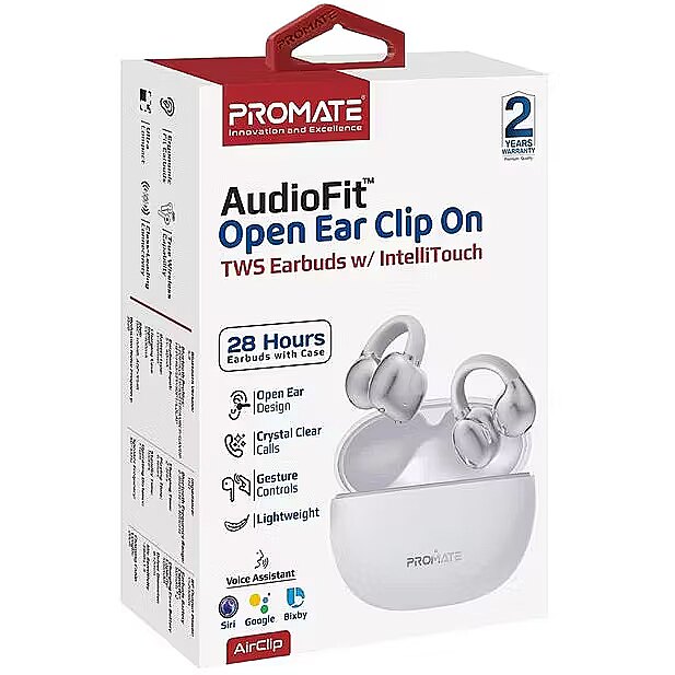 description_en - Promate AirClip are innovative wireless earbuds with an open-ear design, ensuring comfortable wear and high-quality sound. With AudioFit™ technology and IntelliTouch controls, they offer ease of use and an exceptional audio experience.