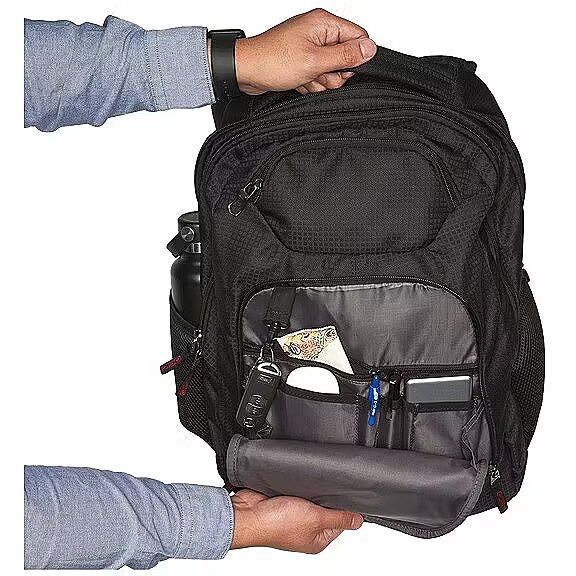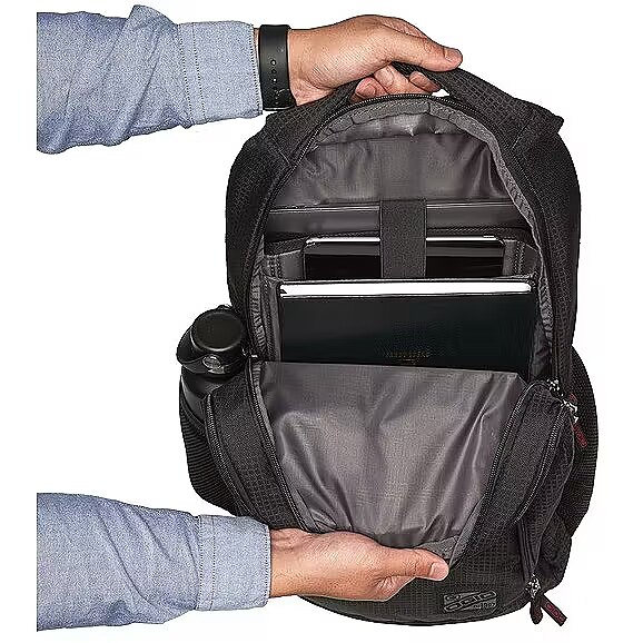 Description - Padded interior laptop compartment fits most 17 laptops Padded iPad/tablet/E-Reader sleeve Zippered fleece lined top valuables pocket Large main compartment for books, binders and files Padded back panel with air mesh for moisture wicking Dual side water bottle/accessory holders Organization panel with zippered stash pocket Front slip pocket Large grab handle Adjustable shoulder straps with sternum strap Photos of additional functionalities are for illustration only