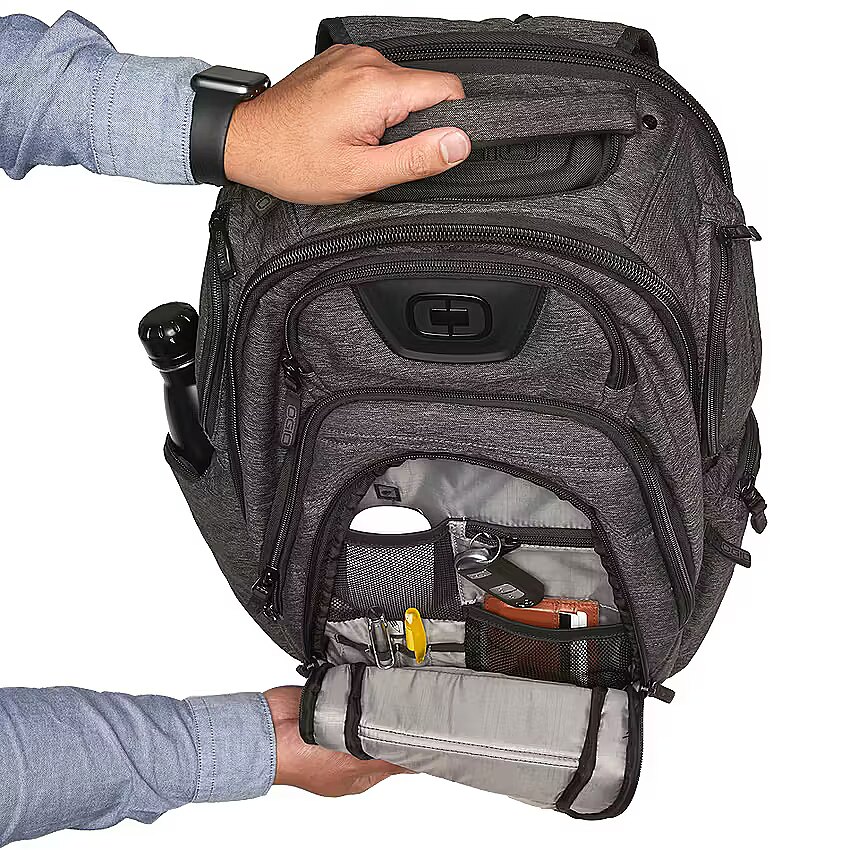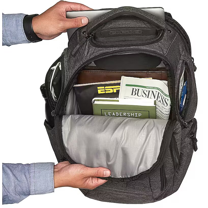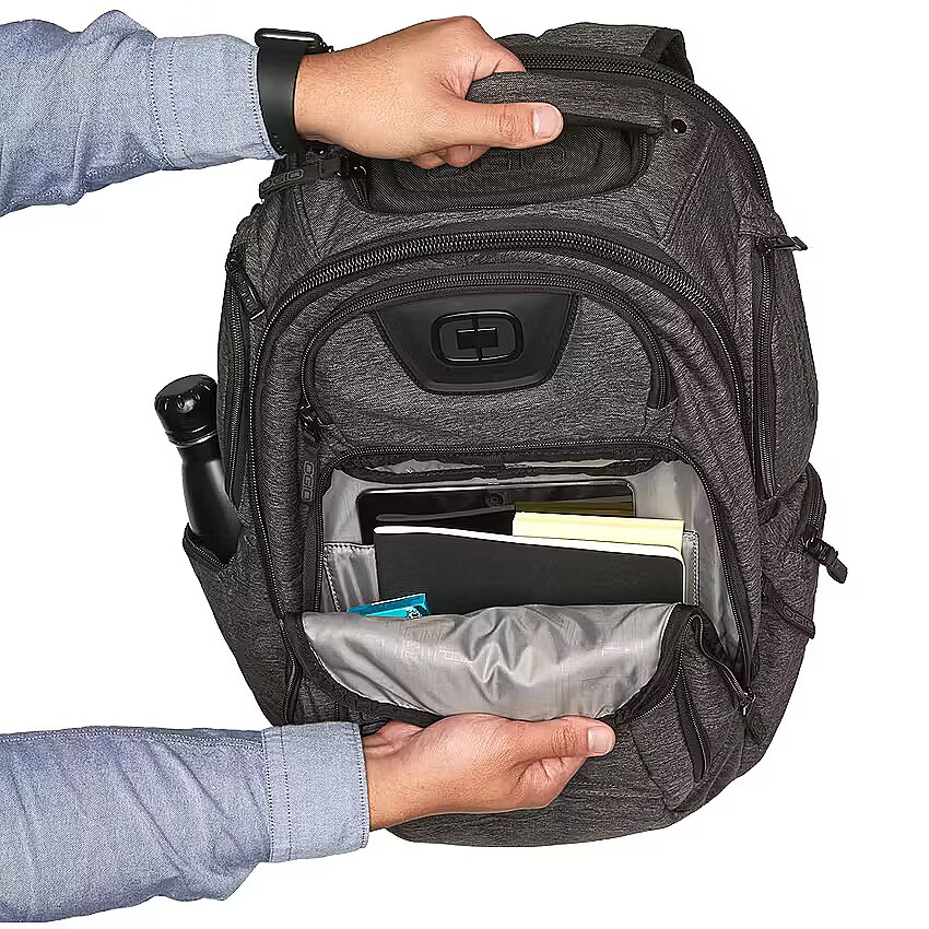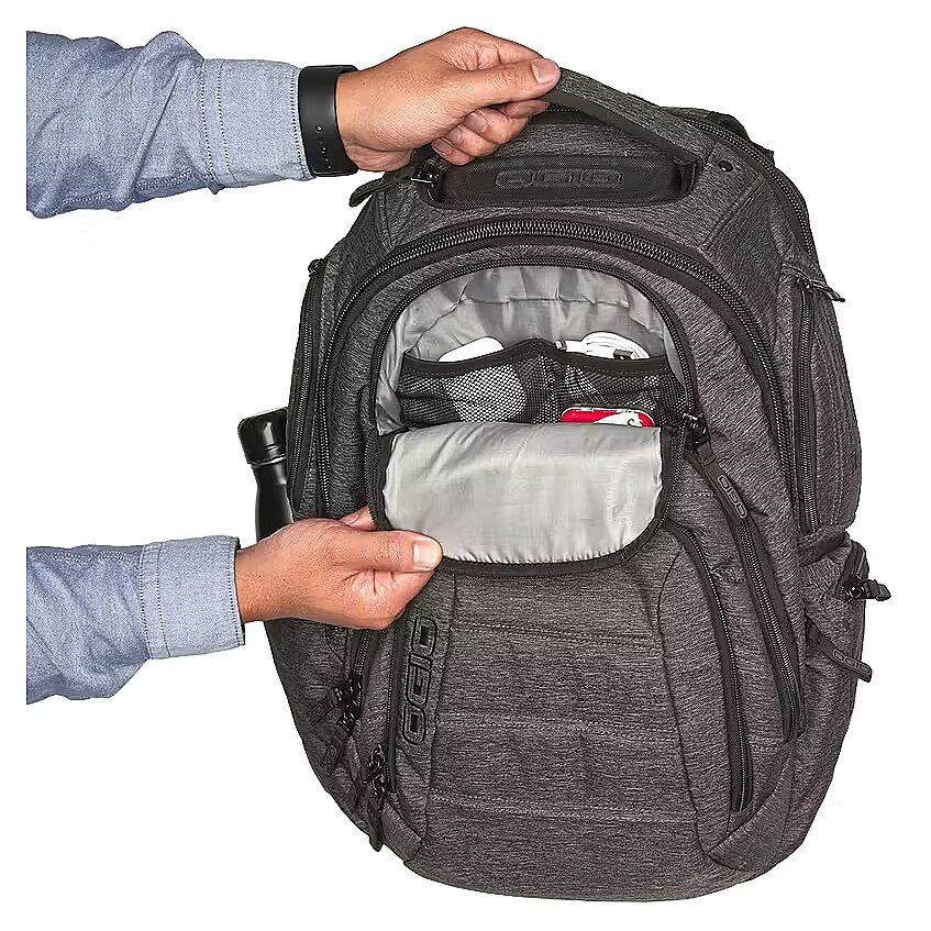 Description - Armor protected dedicated laptop compartment with fits 15" and thinner 17" laptops Integrated foam panels keep your electronics and other valuables protected Luggage handle pass-through for your rolling luggage Padded iPad/tablet/e-reader pocket Crush proof Tech Vault pocket with soft tricot liner HUB (Hybrid Unibody Backpanel) for ultimate comfort Padded mouse/digital camera pocket Increased shoulder strap foam padding creates Sweet Spot comfort zone Fully adjustable ergonomic shoulder straps with sternum strap Two zippered side utility pockets Dual side water bottle/accessory holders Quick access expandable phone pocket Deluxe organization panel with zippered stash pocket Soft touch padded neoprene grab handle Photos of additional functionalities are for illustration only