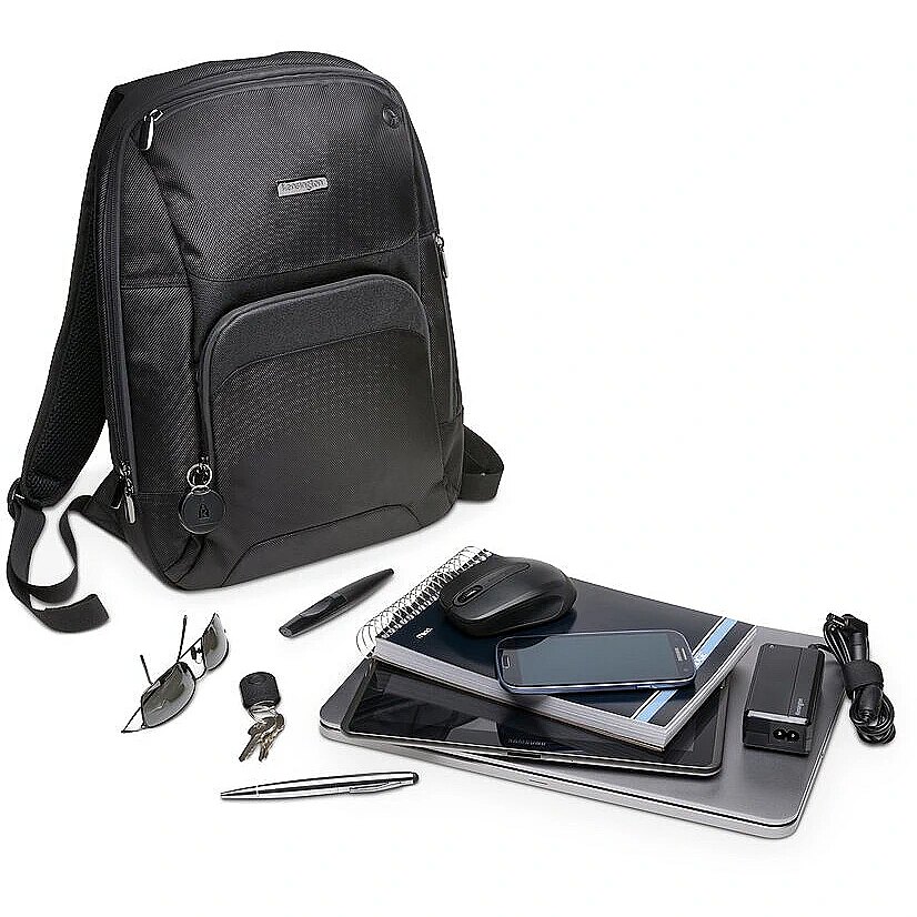 LongDesc - Your Ultrabook is sleek and light, but some of your other essentials? Not so much. Once you add a power brick, your tablet, accessories like a presenter, smartphone, files for the office and more, you suddenly find yourself needing something that can help you carry it all in comfort. Plus you need to make sure your precious Ultrabook and tablet are well padded and protected. That’s where the Kensington Triple Trek Ultrabook Backpack comes in. It features fleece-lined compartments that keep an Ultrabook, tablet computer, and even your smartphone safe from scratches. In between the device compartments is plenty of room for files. You’ll also appreciate the big accessory pocket that holds your power cord and other necessities. We also included a carabineer clip for holding your keys. No more fishing around the bottom of your bag trying to locate your keys! The padded back support system and wide, adjustable padded straps make sure you can take it all with you in comfort. The grab handle doubles as a roller strap to help you fly through the airport. And just to prove that we thought of everything, you’ll find an easy access storage pocket, perfect for your MP3 player or smartphone, with a headphone outlet so you can talk or rock hands-free.