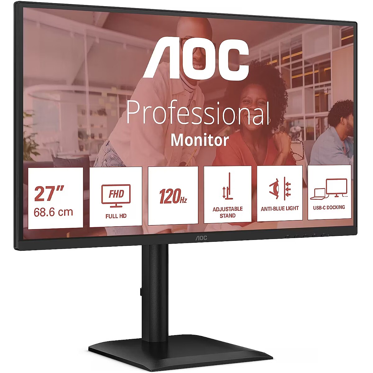 LongSummaryDescription - AOC 27E4CV. Display diagonal: 68.6 cm (27"), Display resolution: 1920 x 1080 pixels, HD type: Full HD, Display technology: LED, Response time: 4 ms, Native aspect ratio: 16:9, Viewing angle, horizontal: 178°, Viewing angle, vertical: 178°. Built-in speaker(s). Built-in USB hub, USB hub version: 3.2 Gen 1 (3.1 Gen 1). VESA mounting, Height adjustment. Product colour: Black