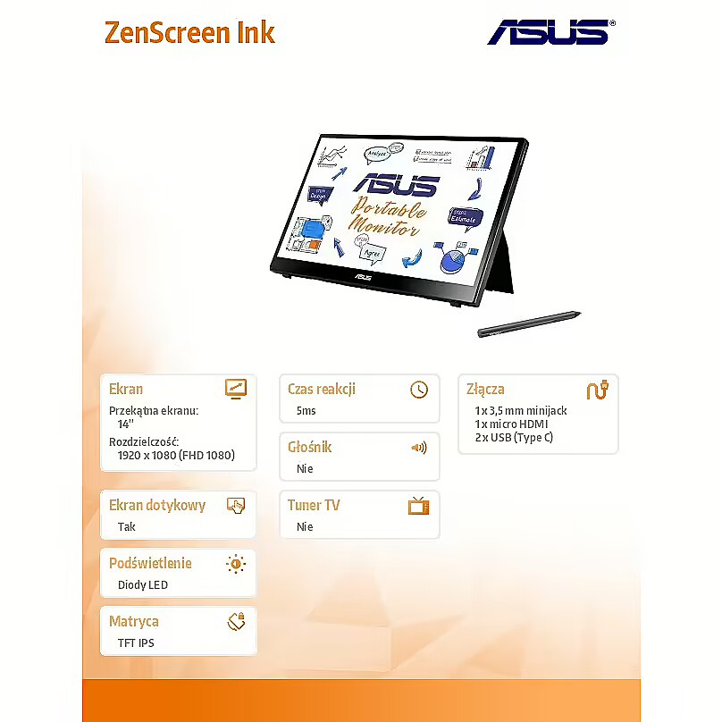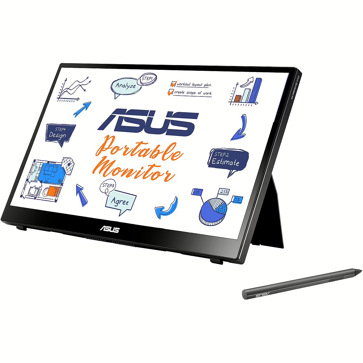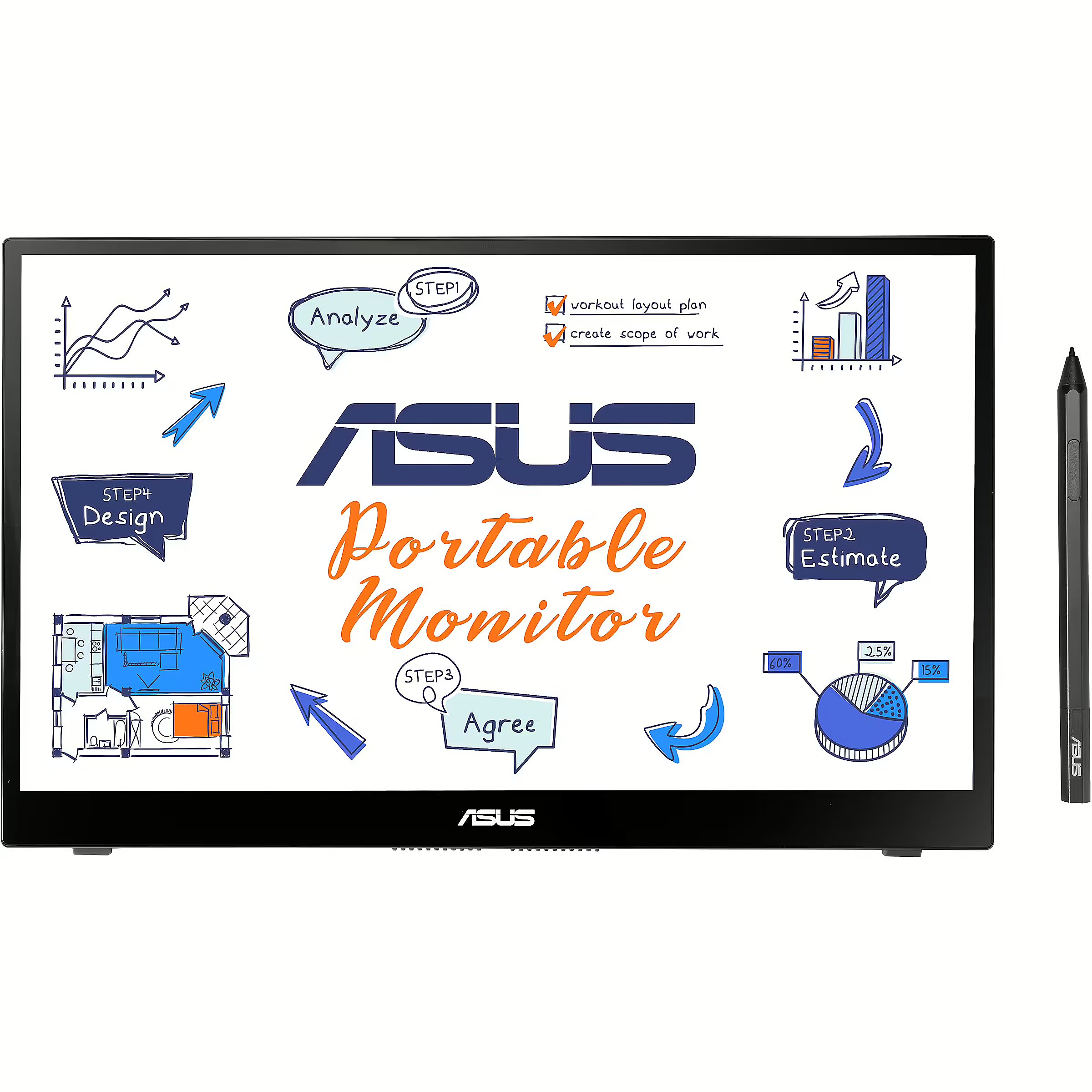 LongDesc - Productivity at the tip of your stylusASUS ZenScreen Ink MB14AHD is a 14-inch IPS FHD portable monitor with 10-point touch functionality and ASUS Pen (SA201H)* that allows users to write, draw anytime and anywhere. The included ASUS Pen features MPP 2.0 and 4096 pressure level for precise and lag-free writing and drawing experiences. It even features an integrated stepless kickstand, enabling ZenScreen Ink to be used in almost any position.*10-point touch and stylus only works in WindowsThe ultimate portable touchscreen and pen combinationWith the MPP 2.0-compliant ASUS Pen, 10-point touch functionality and portable design, ZenScreen Ink is the perfect companion for taking notes, drawing or even signing documents – anywhere, anytime. Use it as an extended display to work more efficiently on the go, or simply kick back for hands-free tasks.ASUS PenTake note of every creative ideaASUS Pen is the perfect accessory for ZenScreen Ink, empowering you to write, draw or annotate in any supported app. It features Microsoft Pen Protocol (MPP) 2.0 technology and 4096-level sensitivity for low latency and fast response, enabling smooth, natural writing experiences. With built-in magnets securing it to the top of the monitor, and lasting up to a year on a single battery charge*, ASUS Pen is ready to use whenever and wherever you want.*Based on average daily use of two hours.Compatible softwareZenScreen Ink is designed for productivity and is fully compatible with numerous writing software and other tools including Microsoft Windows Ink, Whiteboard and OneNote.Tap into productivityWith its interactive 10-point touchscreen, ZenScreen Ink offers highly-accurate, responsive and seamless touch experiences*, enabling you to edit documents, draw on slides or play games with your fingertips. It is Windows 10/11 compatible, allowing you to work smarter and more efficiently.* Availability of 10-point touchscreen functionality depends on operating system.Flexible viewing positionsThe built-in stepless kickstand supports both landscape and portrait modes. It offers up to 150° of hinge movement, so it’s easy to use and flexible for all kinds of touch or writing scenarios. There’s also an integrated tripod socket, enabling ZenScreen Ink to be elevated and oriented into any position.Automatic screen orientationWhen connected to a Windows PC, the ASUS DisplayWidget Lite tool* enables ZenScreen Ink to sense its orientation and automatically switches the display between landscape and portrait modes. Landscape mode is ideal for presentations and spreadsheets, while portrait style provides the perfect long view for documents, books or websites.*Software required. Auto-rotate function works only with the Windows operating system.Rich connectivityZenScreen Ink includes a Micro HDMI® port and two USB-C® ports with DisplayPort™ Alt Mode for quick connections to compatible devices. The USB-C ports can also be used for power input.Protect your eyes with ASUS Eye Care technologyASUS Ultra-Low Blue Light technologyExclusive ASUS Ultra-Low Blue Light technology protects you from potentially harmful blue light. It offers four filter settings that are easily accessed through the onscreen display menu via the hotkey.Blue Light Filter LevelASUS Flicker Free technologyTÜV Rheinland-certified ASUS Flicker Free technology eliminates flicker, ensuring comfortable viewing experiences. This technology helps minimize eyestrain and other ailments typically associated with extended hours of viewing.
