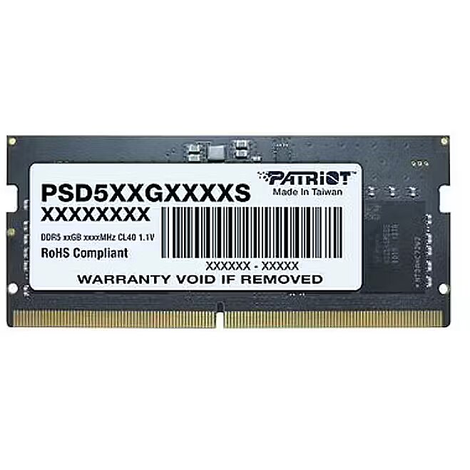 Description - Patriot Signature Line DDR5 12GB (1 x 12GB) 5600MT/s SODIMM Patriot's Signature Line DDR5 memory modules are designed to deliver an immense performance improvement for next generation Intel platforms. Requiring only 1.1V of power, Signature DDR5 modules consume less power and emit less heat despite the increased frequency and speed. Enhanced power improvements include an onboard Power Management IC (PMIC), which provides better control of local voltage regulation while delivering increased threshold protection, simultaneous monitoring, intelligent voltage, and power management. The Signature Line DDR5 series includes onboard thermal sensors to monitor and protect against thermal issues and better overall reporting. In addition, the latest on-die ECC (Error-Correcting Code) further enhances the accuracy of data-processing and your overall system's stability. With limited lifetime warranty, Patriot's Signature Line DDR5 RAM is the breakthrough choice for avid system integrators and those looking to expand their system's memory performance. The Signature Line DDR5 memory modules offer a wide range of capacities and configurations, allowing users to get the most from the latest Intel platforms for the best compatibility. Series: Signature Line Form Factor: 262-Pin Small Outline Dual In-Line Memory Module (SODIMM) Technology: DDR5 Non-ECC Unbuffered 100% Tested Single-sided Module Operating Temperature: 0°C - 85°C RoHS Compliant Limited Lifetime Warranty